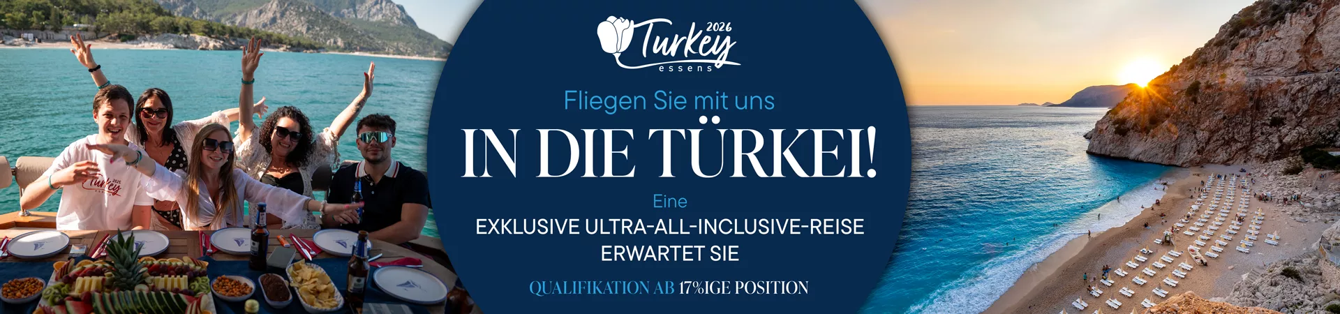ESSENS bietet Ihnen finanzielle Freiheit, persönliche Entwicklung und unbegrenzte Wachstumsmöglichkeiten. Mit uns können Sie Ihr eigenes Unternehmen mit Premiumprodukten aufbauen und ein bewährtes Geschäftsmodell nutzen, das Ihnen unbegrenztes Wachstum ermöglicht. Wir organisieren inspirierende Kick-off-Events und Bildungsseminare in ganz Europa und bieten den Erfolgreichsten einen luxuriösen, voll bezahlten Urlaub in der Türkei.